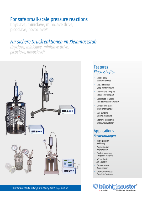 Dieser universelle Druckreaktor kann mit verschiedenen austauschbaren Glas-Druckbehältern betrieben werden. Sämtliche benetzten Materialien sind "nicht-metallisch" und chemisch inert. Druckreaktionen können durch integrierte Sicherheitsvorkehrungen sicher durchgeführt werden.