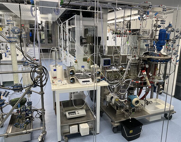 Die Anlage vereint drei verschiedene Arten von Reaktoren: einen klassischen 1-Liter-Doppelmantelreaktor, der typischerweise in der Forschung Verwendung findet; einen Fermenter von Bioengineering und einen 30-Liter-Büchi-Reaktor mit Destillationsaufbau. Der 30-Liter-Büchi-Reaktor mit Destillationsaufbau basiert auf einem Büchi midiPilot-Reaktor ist ein vielseitiges und leistungsfähiges Gerät, das für eine Vielzahl von chemischen Reaktionen und Prozessen in Forschung, Entwicklung und Produktion geeignet ist.