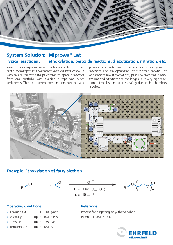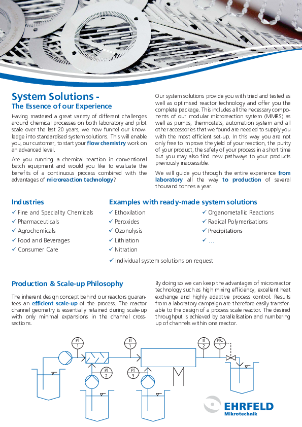 Based on 20 years of experience working with customers on a laboratory and pilot scale, Ehrfeld is bundling the knowledge into standardized system solutions. In this way, they enable their customers to start from a better position in the world of flow chemistry.